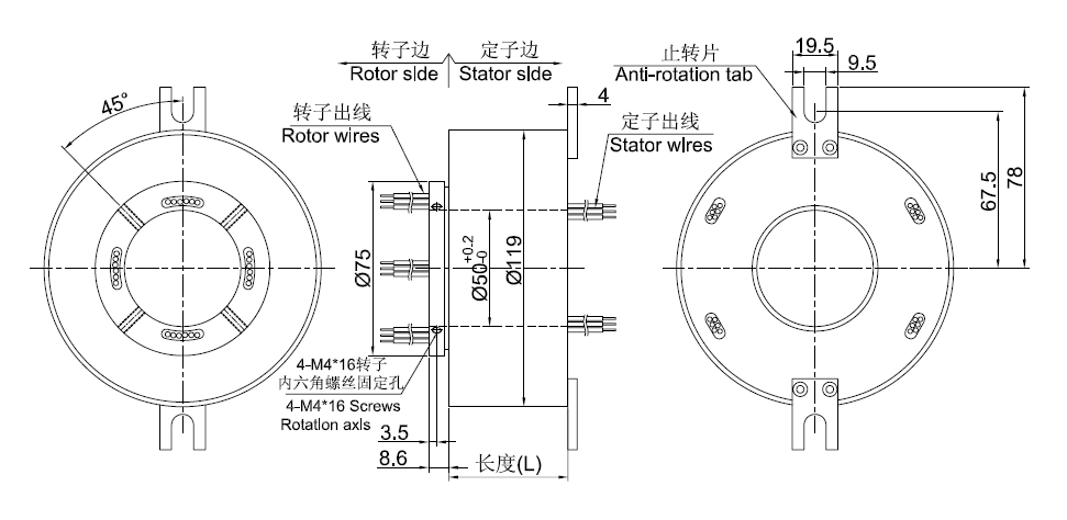 DT50119系列是一款孔徑50mm,外徑119mm,整體式精密導電滑環(huán),主要應用于